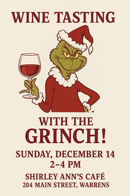 Join us for Wine Tasting with the Grinch at Shirley Ann’s Café in Warrens, WI. Enjoy samplings from DnA Vintners. There is no fee for this event, however, accepting donations for the Sparta Boys & Girls Club.