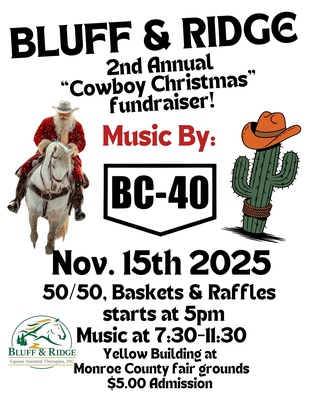 Bluff & Ridge's 2nd Annual “Cowboy Christmas” Fundraiser is back and bigger than ever! Get ready to jingle your spurs and dance the night away while supporting Bluff & Ridge Equine Assisted Therapies, Inc. — a nonprofit helping people heal through horses.