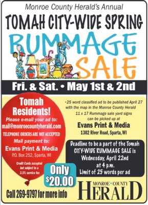 Residents... Looking to advertise your sale in the Monroe County Herald? Contact Evans Print & Media to take part in their rummage sale advertising promotion for only $20. Included is a 25-word classified ad to be published April 27, 2026, with the map in the Monroe County Herald and 11x17 rummage sale yard signs, which can be picked up at Evans Print & Media in Sparta, 1302 River Road, Sparta, WI.