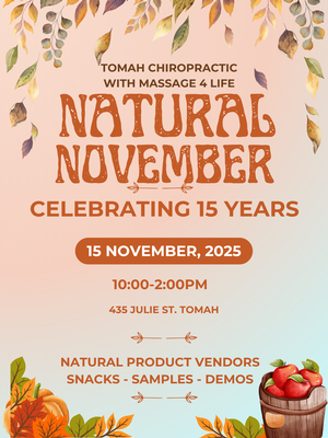 Join Tomah Chiropractic with Massage 4 Life for Natural November, celebrating 15 years, on Saturday, November 15, 2025, from 10am to 2pm at 435 Julie Street, Tomah. Enjoy natural product vendors, snacks, samples, and demos.
