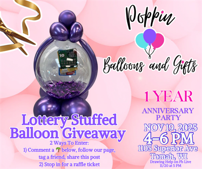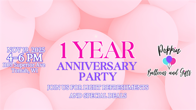 We’re celebrating ONE amazing year of bringing joy, creativity, and balloons to Tomah — and we want YOU to join the party!