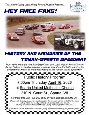 Public History Program: “Hey Race Fans! History & Memories of the Tomah – Sparta Speedway”, held on Thursday, April 16th at 7pm.