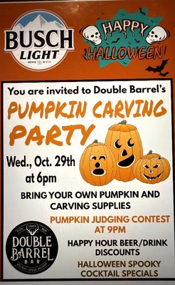 You're invited to Double Barrel's Pumpkin Carving Party! Bring your own pumpkin and carving supplies. Pumpkin judging contest at 9pm. Happy hour beer/drink discounts and Halloween spooky Coctail Specials.