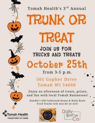 Join us for tricks and treats on Saturday, October 25th, 2025 from 3-5pm at Tomah Health, 501 Gopher Drive, Tomah. Enjoy an afternoon of treats, prizes, and fun with local Tomah Businesses! Handly's Old Fashioned Donut & Daily Brew food trucks will also be on site!